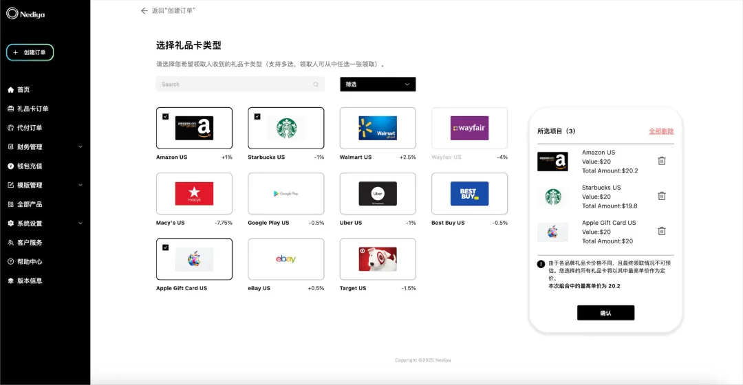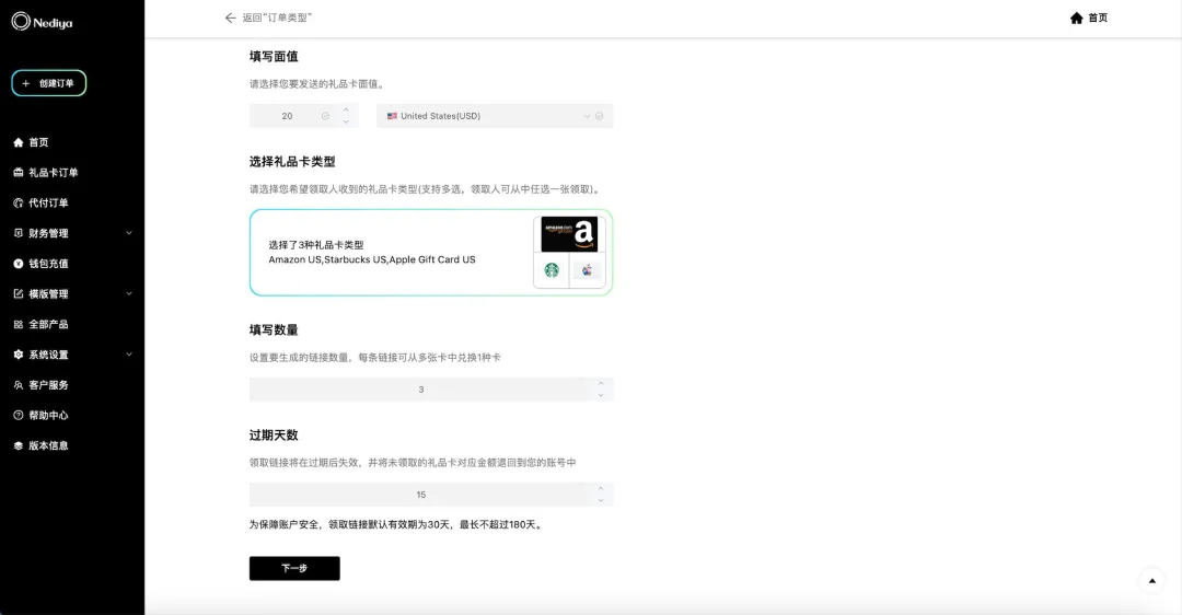 2. 选择想要的礼品卡面值、品牌、数量和过期天数