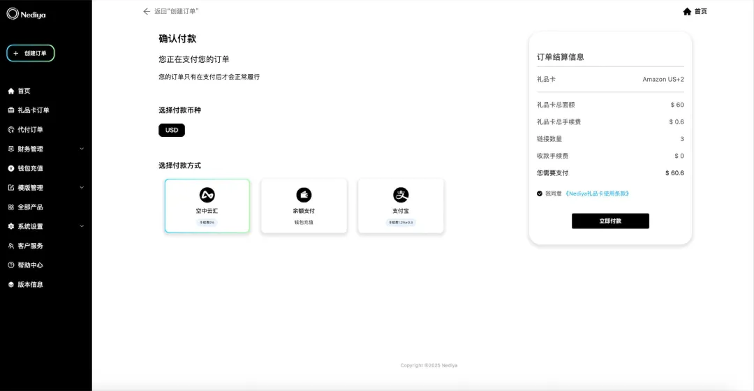 3. 支付订单(支持空中云汇、支付宝、银行转帐)