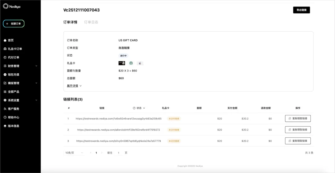 4. 支付完成后,链接会即时生成,用户可以在“礼品卡订单”页面查看。