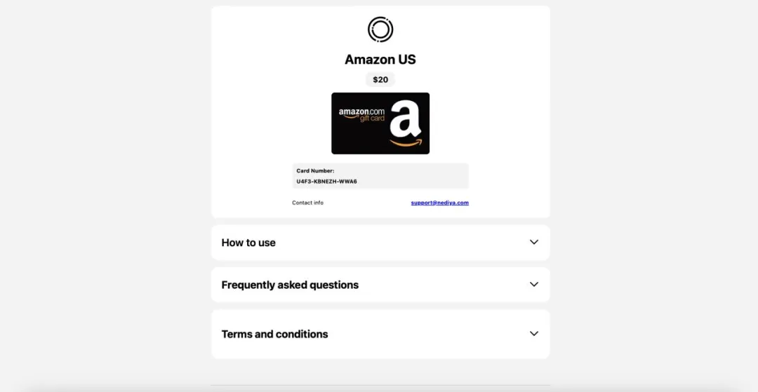 以选择美国亚马逊礼品卡为例,在点击兑换后会直接呈现亚马逊礼品卡的兑换码