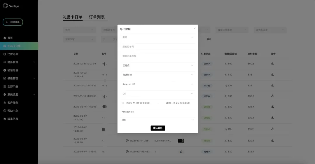 6.关于财务对账方面:卖家可以从奈达系统中直接导出礼品卡的购买与发放情况,所有数据清晰可查。